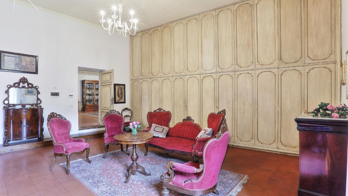 Ceiling with frescoes from the 1700s depicting the family's properties, it is characterized by the bright colors of the fresco repeated in the bathroom and in the furnishings.