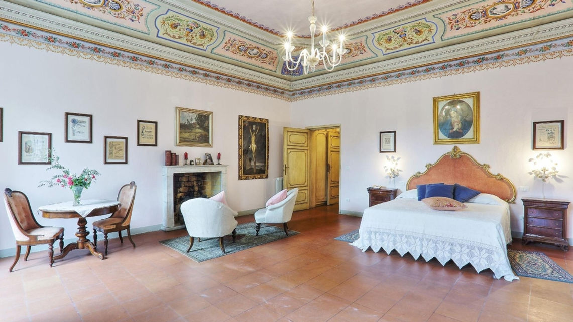 Large Suite located on the south-east side of the villa on the first floor, exposed to the sun for the whole day, it owes its name to the splendid view enjoyed from the windows, from where you can see the entire park of the villa with the swimming pool and glimpses of the ancient village beyond the surrounding walls.